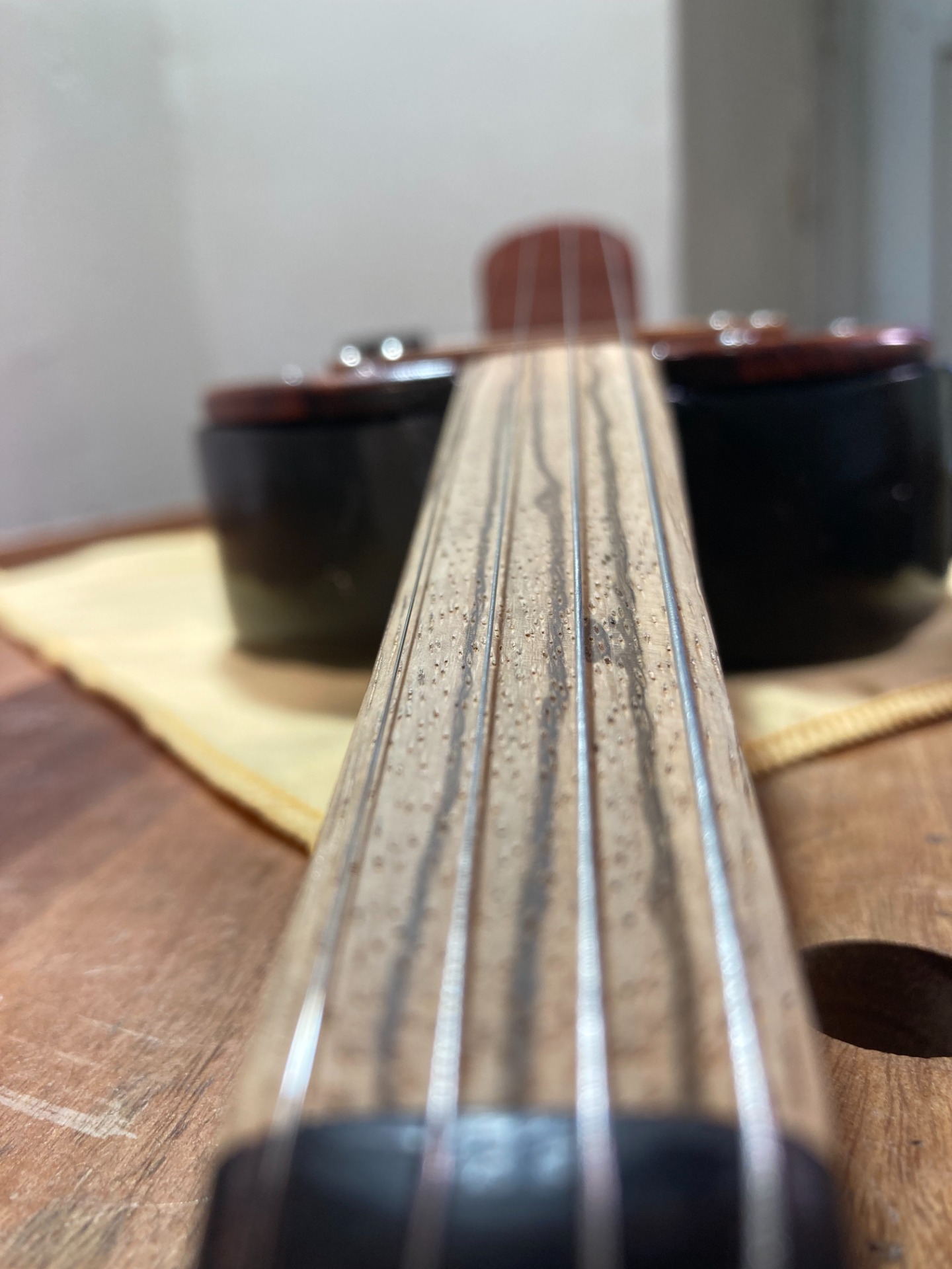 Diapasón en zebrano, elegido por su dureza, estabilidad y estética marcada.